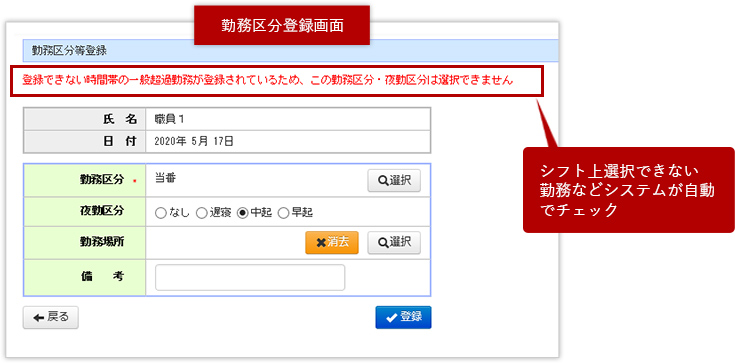 超過勤務の発生した日時や業務内容が表示され区分ごとの集計がされています。